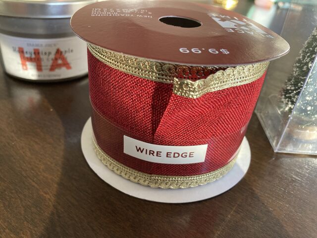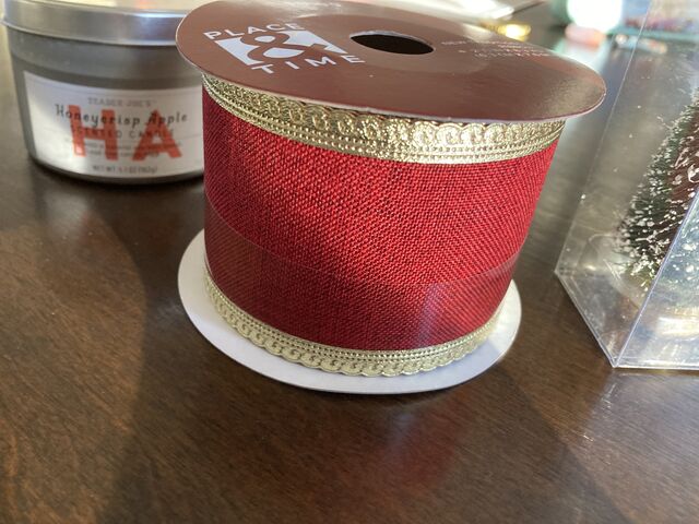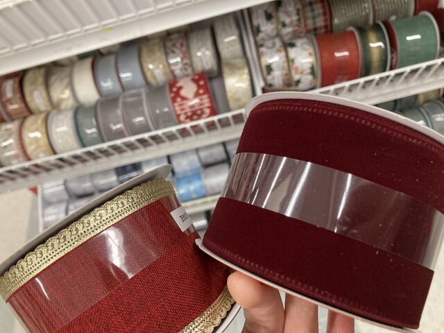 写真右のベルベット素材も欲しかったのですが、赤でももう少し色味が異なる商品がありそう。今年はこの暗めの赤しか残っていなかったので、左の麻っぽい生地に金縁のリボンを購入。