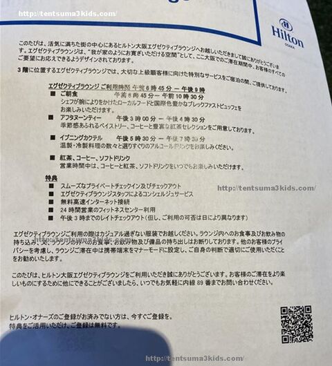 ラウンジも朝食も2名まで無料と言われていますが、ヒルトン大阪では子供は無料で一緒に入ることが出来ます(2023夏現在)。コンラッド東京やヒルトン小田原は、子供の年齢によっては不可(我が子は無理だったので追加料金を払っています)。