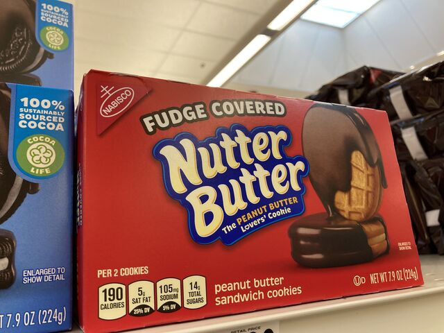 ↓オレオの横にあったお菓子。同じナビスコの商品ですが「ピーナッツバターサンドイッチクッキーをチョコで覆った Nutter Butter」。名前的にカロリーがすごそう(クッキー2枚で190カロリーと書いています)。