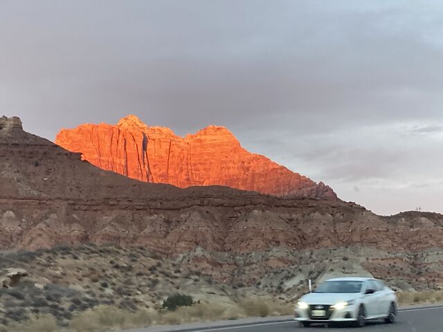 夕焼けを反射して、山(岩?)が染まっています。急いでいたので、1度も止まらず。
