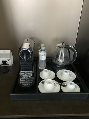 無料の水2本あり。コーヒー類は他のコンラッドホテルと同じ。スプーンが何故か2個のみ(補充し忘れ?)