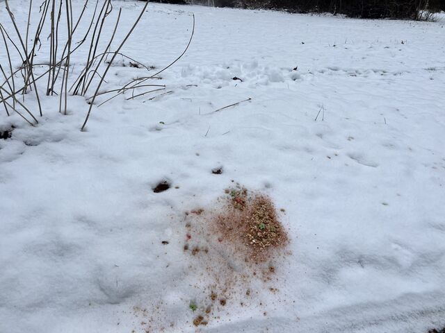 ただでさえ元から荒れ放題の庭なので、トナカイの食べ物を撒きました。まずは、表の庭の道路に面している縁に(一番我が家に影響が少ない