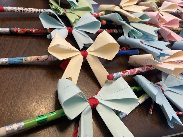 この折り紙のリボン、子供をプリスクールに迎えに行ったときに話したことがなかったお母さんから