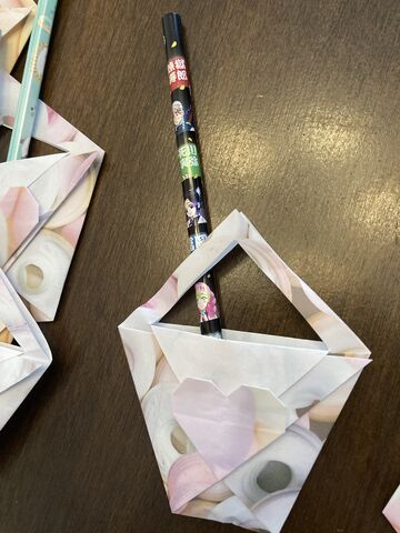 第3子幼児のクラスメートへのバレンタインデーのギフトは、折り紙に鉛筆をセット。