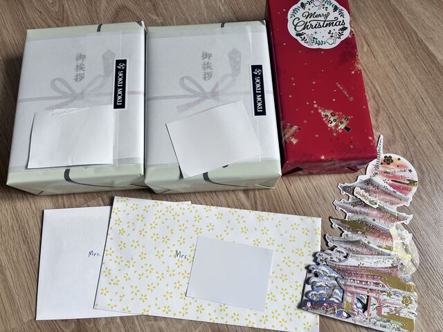 お次は、アメリカのクリスマスに必須のクリスマスカード。こちらも偶然日本風のものを友人からもらいました。なにやら、友人のお姉さんは海外の人とつながりが多く、たくさん持っていて使いきれなかったとか。
